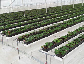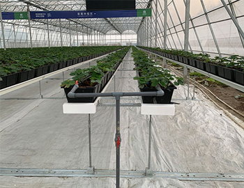 雙排草莓栽培種植系統(tǒng),采用內排水式且連續(xù)生產(chǎn)的鍍鋅高耐候聚酯涂層板栽培槽,防腐好,強度高,排水更通暢,無接頭,避免排水槽對接出現(xiàn)漏水現(xiàn)象。采用內排水截面,有效阻止葉子掉落排水溝引起排水不暢,同時避免陽光直射,導致排水溝滋生青苔綠藻。釆用通長底板支架支撐方式,使支軌道連成一個整體,支撐強度和穩(wěn)固性更好。栽培槽間距:1.6米雙排布置。
